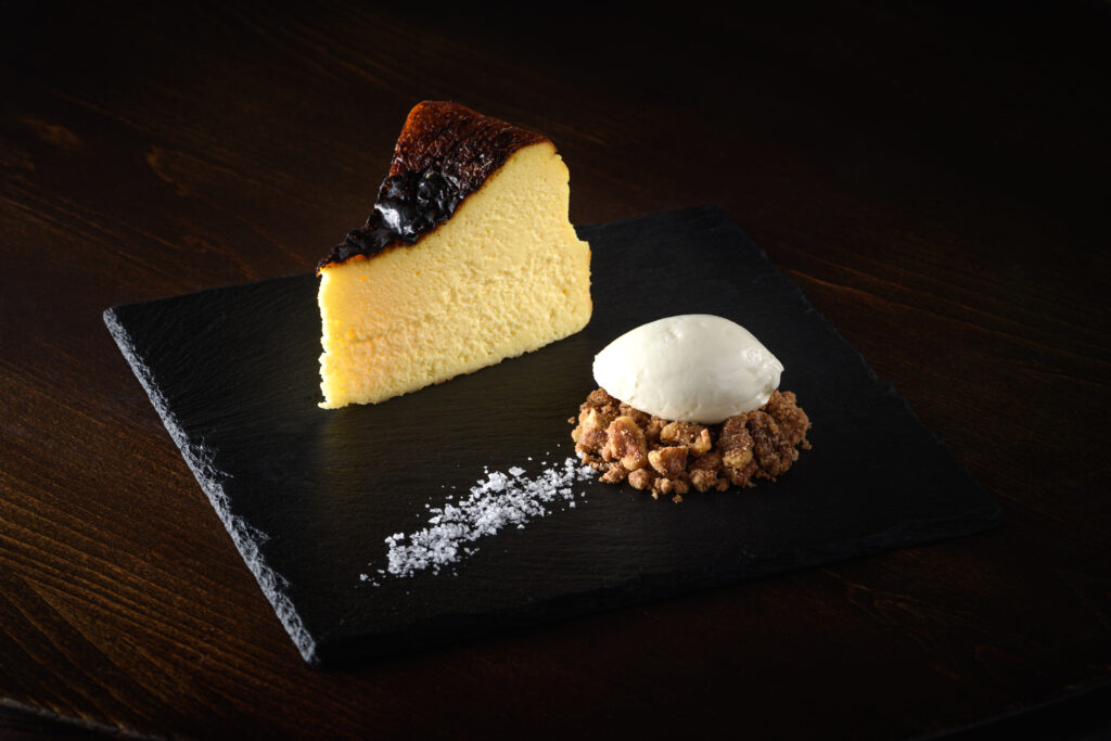 スペインのバスク地方発祥のチーズケーキ。表面を高温で短時間焼き付けて真っ黒の焼き目をつけることで、外側はカリッとしたカラメルのようなほろ苦さと香ばしさが。内側はたっぷり贅沢にクリームチーズを使い、濃厚なチーズの風味とねっとりとした食感を楽しめます。アクセントで岩塩をまぶせば、止まることのない幸せに包まれることでしょう。